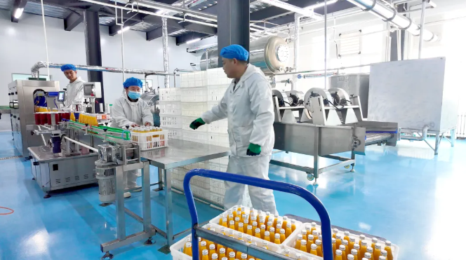 走进内蒙古野维佳生物科技有限公司出产车间,全自动流水线高速工作,洗选、压榨、灌装、封装等工序趁热打铁,沙棘汁等多款本乡特征饮品连绵不断下线。